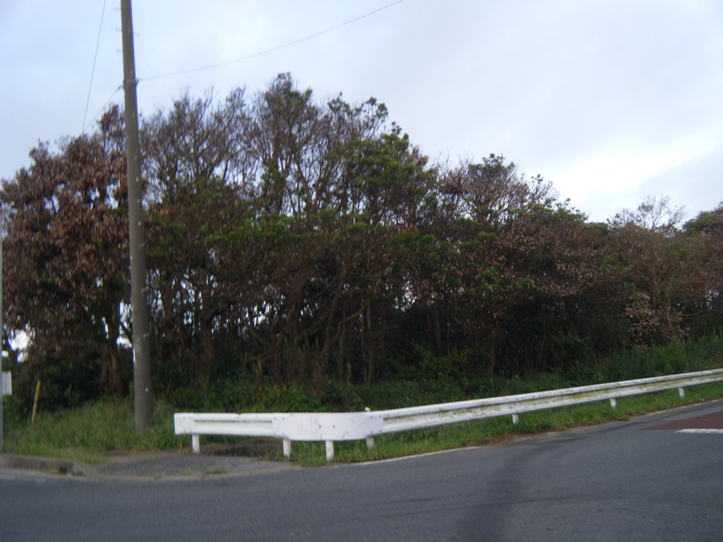 この周辺も波打ち際から1kmほど津波の被害に遭い、そのとき運ばれた塩害によって イヌマキ・クロマツ・タブノキ・シノダケ林が葉が赤くなり枯れていました。